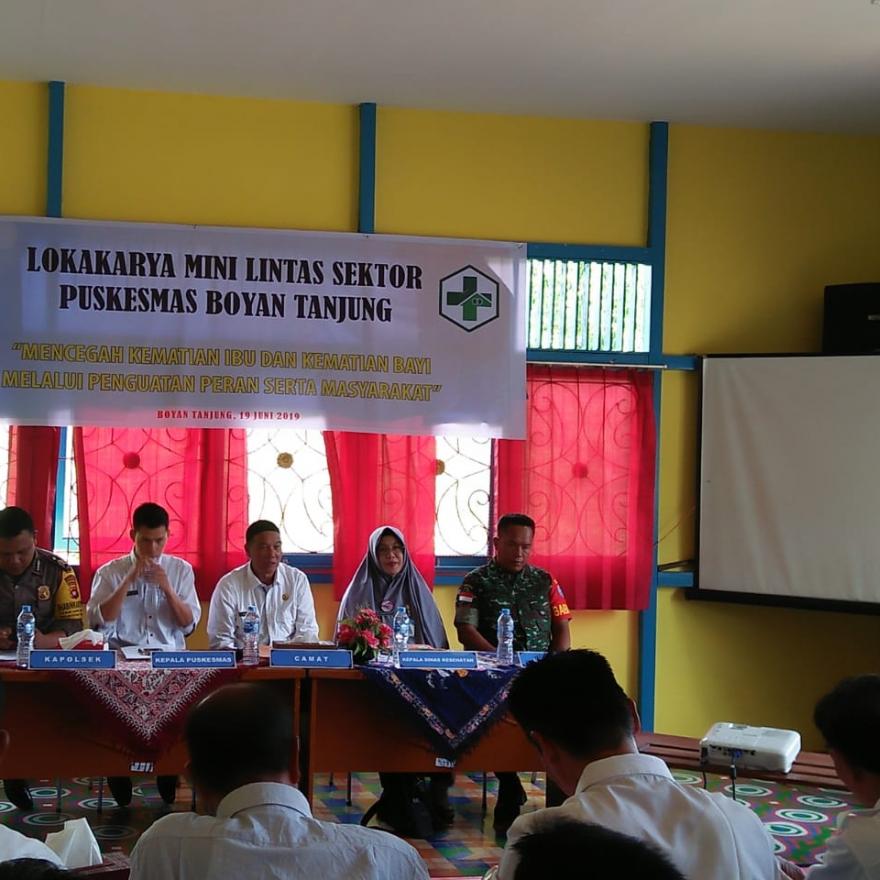 Kepala Puskesmas boyan tanjung dan camat boyan tanjung melaksanakan kegiatan lokakarya di Aula kecamatan boyan tanjung kabupaten Kapuas Hulu di damping Oleh Ibu ROZANA HAYATI, A. Md. Keb KASI Kesehatan Keluarga Dinas Kesehatan Kabupaten Kapuas Hulu dan staff Seksi dinas Kesehatan Kabupaten Kapuas Hulu Ibu YUYUN WAHYUNI, A. Md. Keb, beserta seluruh Kepala Desa sekecamatan Boyan Tanjung dan staff Dinas Kesehatan Kecamatan Boyan Tanjung.