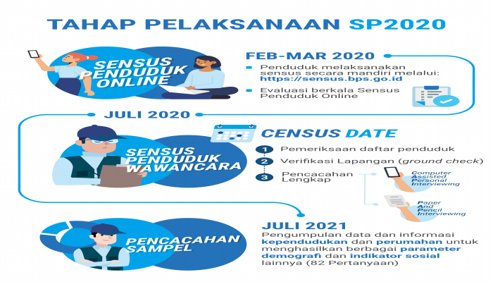 Bentuk orang bergandengan dan mengangkat tangan mewakili kegiatan sensus penduduk di mana penduduk merupakan elemen utamanya serta diperlukan keterlibatan seluruh warga Indonesia dalam mensuskseskan Sensus Penduduk 2020. Bentuk pita tali yang tersambung menggambarkan bahwa kegiatan sensus penduduk merupakan kegiatan yang berkelanjutan. Pita tali ini juga menggambarkan grafik data dan tanda centang (check list), menunjukkan kegiatan Sensus Penduduk 2020 dilakukan secara profesional dan memastikan semua warga terdaftar Sensus Penduduk 2020.