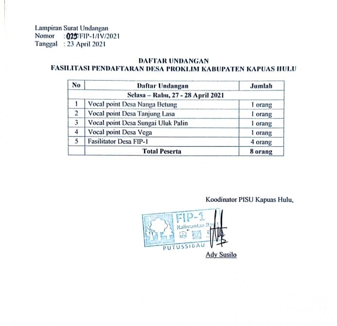 Kegiatan ini di laksanakan di Aula Balai Besar TNBKDS Kabupaten Kapuas Hulu, dari tanggal 27-28 April 2021, yang di ikuti oleh masing-masing peserta Vocal Point yang telah ditunjuk oleh Desa yang diundang, kegiatan ini adalah tindak lanjut dari beberapa tahapan sosialisasi khususnya Desa Nanga Betung Kecamatan Boyan Tanjung Kabupaten Kapuas Hulu Provinsi Kalimantan Barat oleh Projeck Forest Investment Program ( FIP-1 ) Kabupaten Kapuas Hulu melalui lembaga Pengelolaan Hutan Desa " LPHD PUNDJUNG BATARA " Desa Nanga Betung, selanjutnya Masyarakat Desa Nanga Betung diberikan Peluang untuk meregistri Desanya ikut serta dan berperan skala nasional di Kementerian Lingkungan Hidup dan Kehutanan